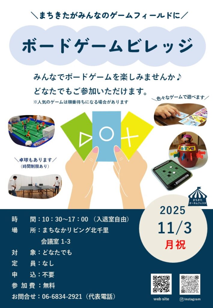 11/3(月祝) ボードゲームビレッジ みんなでボードゲームを楽しみませんか♪どなたでもご参加いただけます。 ※人気のゲームは順番待ちになる場合があります 【注意事項】※広報による写真撮影があります。当館HP・SNSに掲載されますのでご了承くださいませ。 日時11/3(月祝) 10:30~17:00(入退室自由)場所まちなかリビング北千里会議室1~3対象どなたでも定員なし申込不要参加費無料お問合せ06-6834-2921(代表電話)