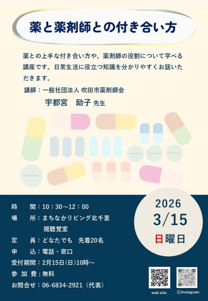 薬との上手な付き合い方や、薬剤師の役割について学べる講座です。日常生活に役立つ知識を分かりやすくお話いただきます。