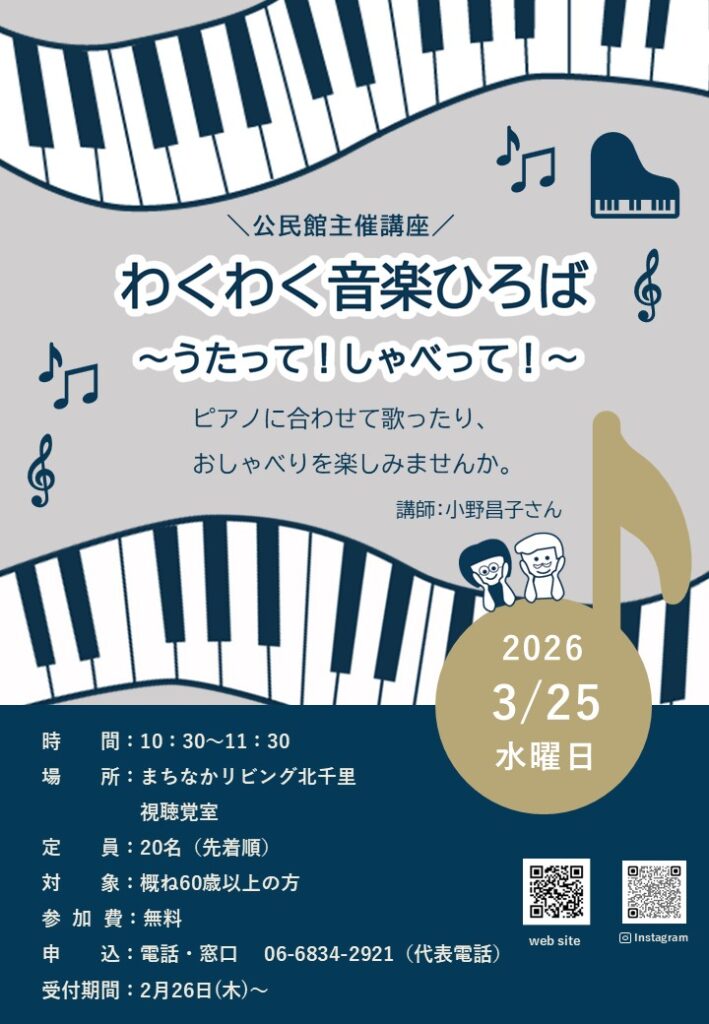 3/25(水) わくわく音楽ひろば~うたって!しゃべって!~ ピアノに合わせて歌ったり、おしゃべりを楽しみませんか。 講師:小野昌子さん 日時3/25(水) 10:30~11:30場所まちなかリビング北千里 視聴覚室 対象概ね60歳以上の方定員先着20名参加費無料申込電話・窓口受付期間2/26(木)~お問合せ06-6834-2921(代表電話)