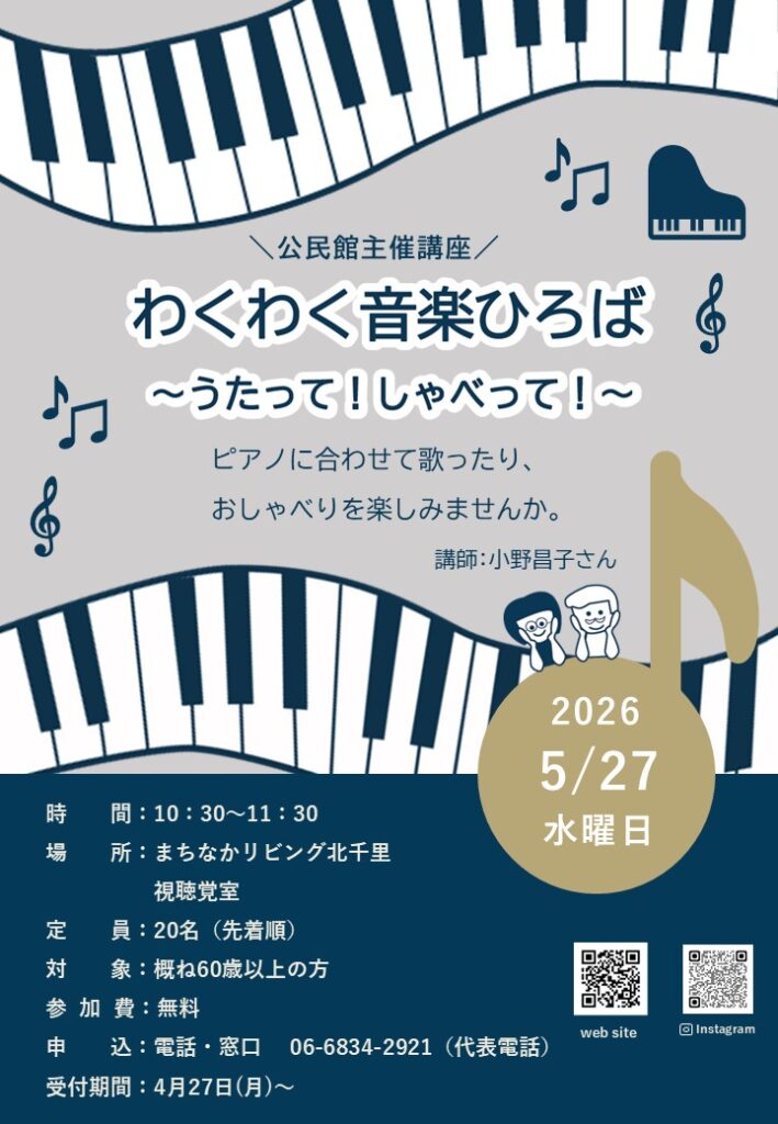 5/27(水) わくわく音楽ひろば~うたって!しゃべって!~ ピアノに合わせて歌ったり、おしゃべりを楽しみませんか。 講師:小野昌子さん 日時5/27(水) 10:30~11:30場所まちなかリビング北千里 視聴覚室 定員20名(先着)対象概ね60歳以上の方参加費無料申込電話・窓口受付期間4/27(月)~お問合せ06-6834-2921(代表電話)