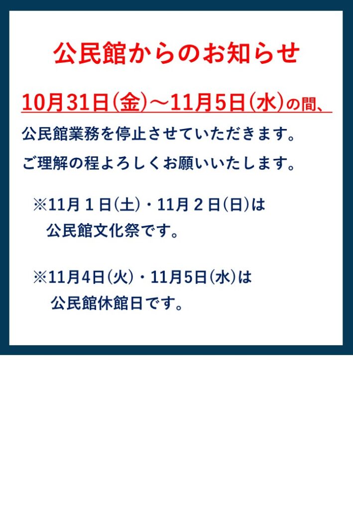 公民館からのお知らせ 10月31日(金)~11月5日(水)の間、公民館業務を停止させていただきます。ご理解の程よろしくお願いいたします。 ※11月1日(土)・11月2日(日)は公民館文化祭です。 ※11月4日(火)・11月5日(水)は公民館休館日です。